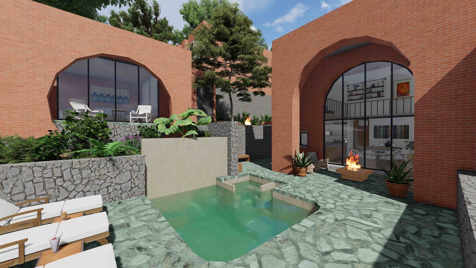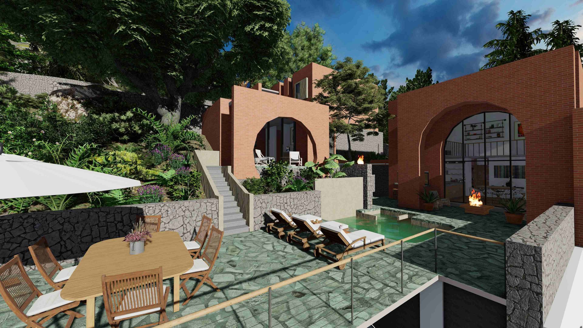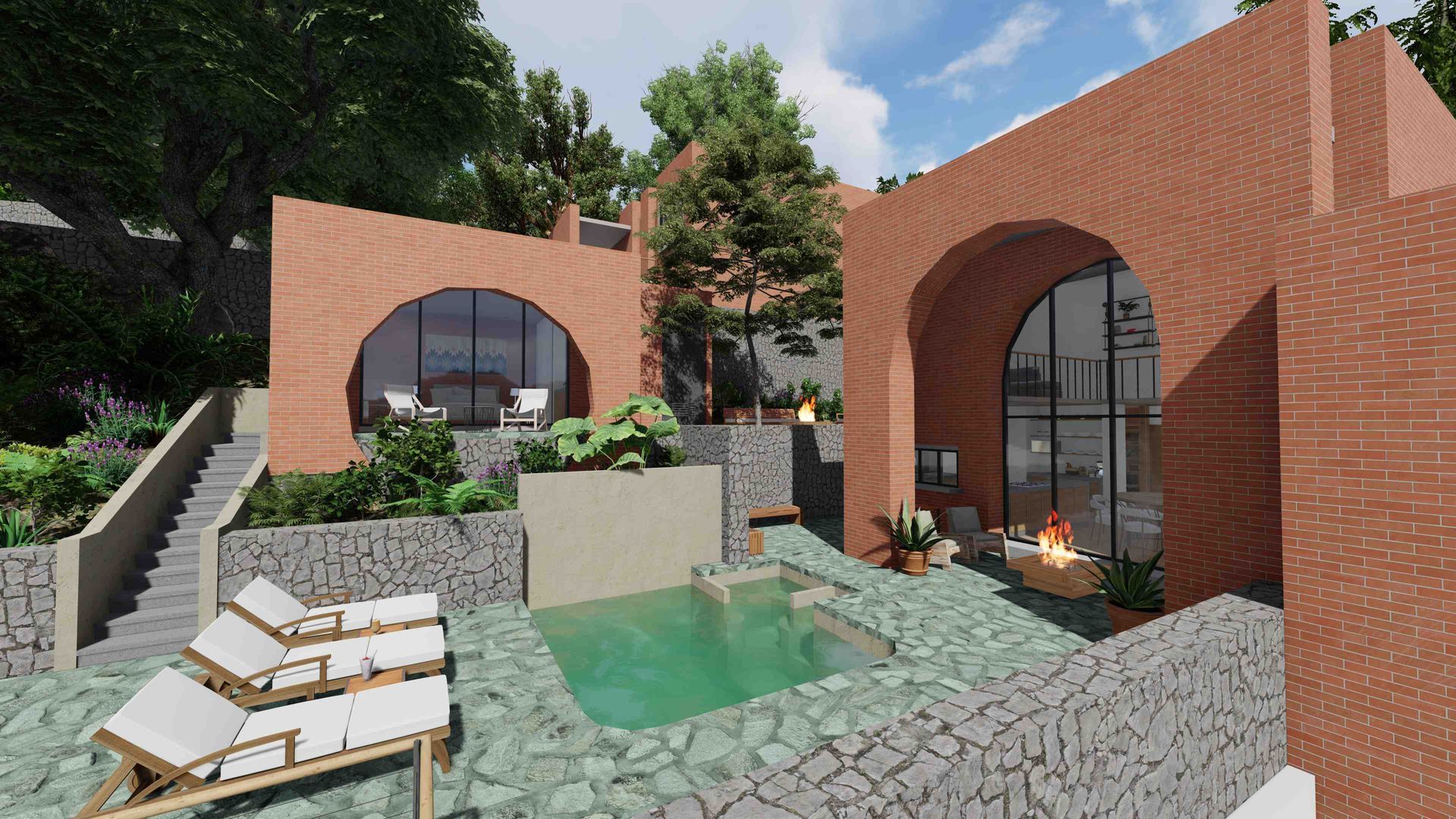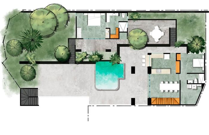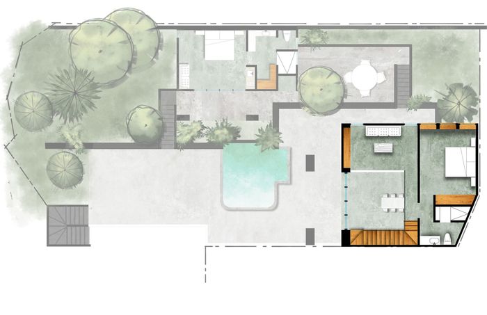 Actualmente está a la venta la Casa 2. Se compone de una casa principal en dos pisos y un Bungalow independiente con su baño completo y cocineta. Los dos volumenes abrazan una explanada principal con su alberca y están rodeados por espacios jardinadas.
